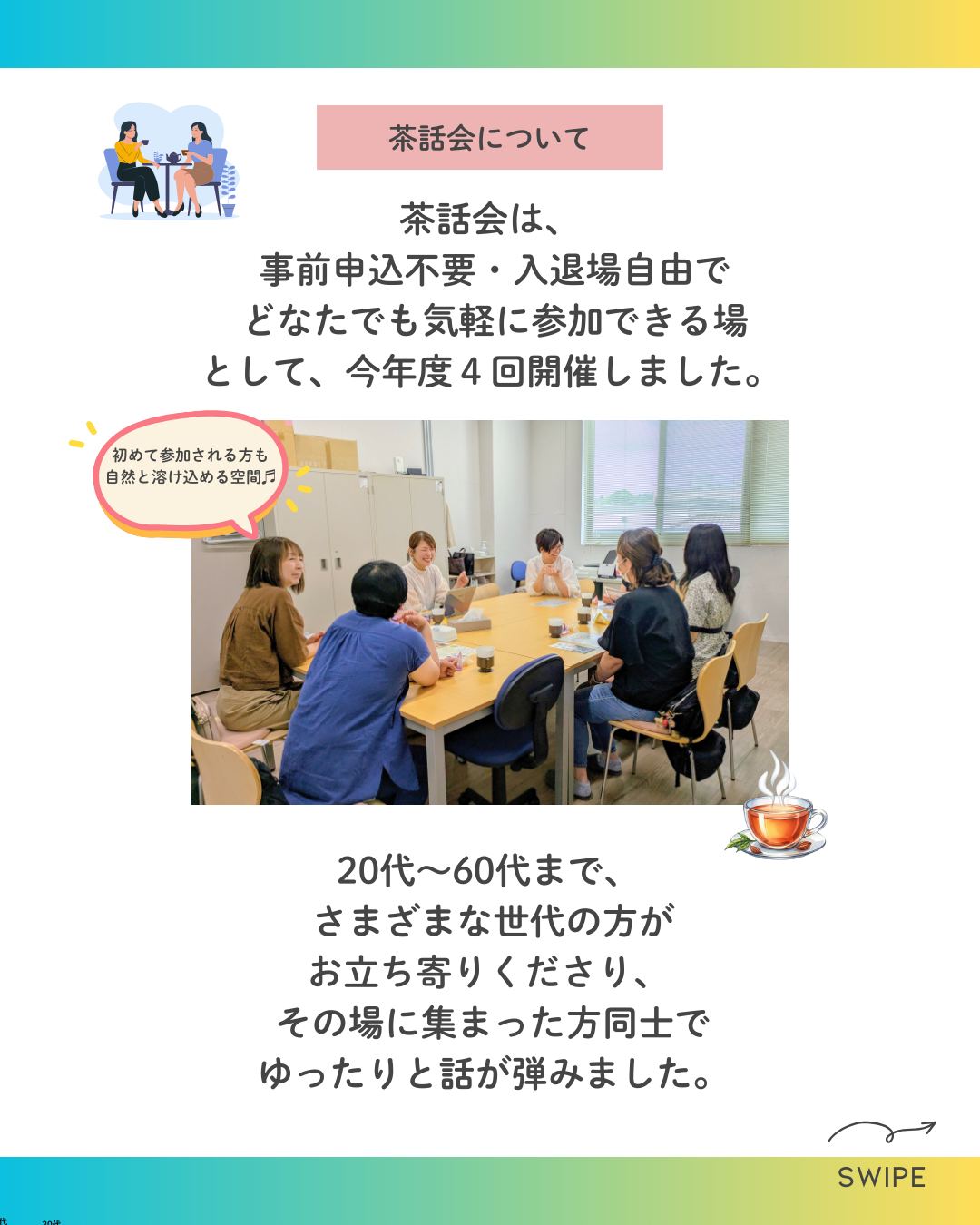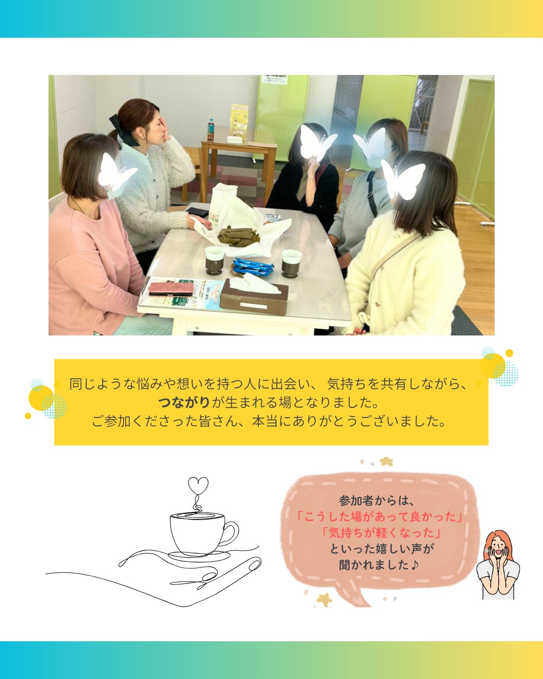 ㈱ケイリーパートナーズ 2hoursからのお知らせ ご報告 R7年度LWS事業 総集編 6~10月実施 茶話会 by 2hours-Wassy 12月 24, 2025 0 Comment 今年度のイベントに参加してくださった白河の皆さんから、 「もう今年は茶話会ありませんか?」と声をかけていただきました。 ラップアップイベントが終わって、はやひと月。 それでもこうして想いを寄せ続けていただける事業になったことを、 とても嬉しく、ありがたく感じています。 安心してつながれる場所があるって、幸せ。 これからも、丁寧に、大切に育てていきたい居場所です。 いいね:いいね 読み込み中…
